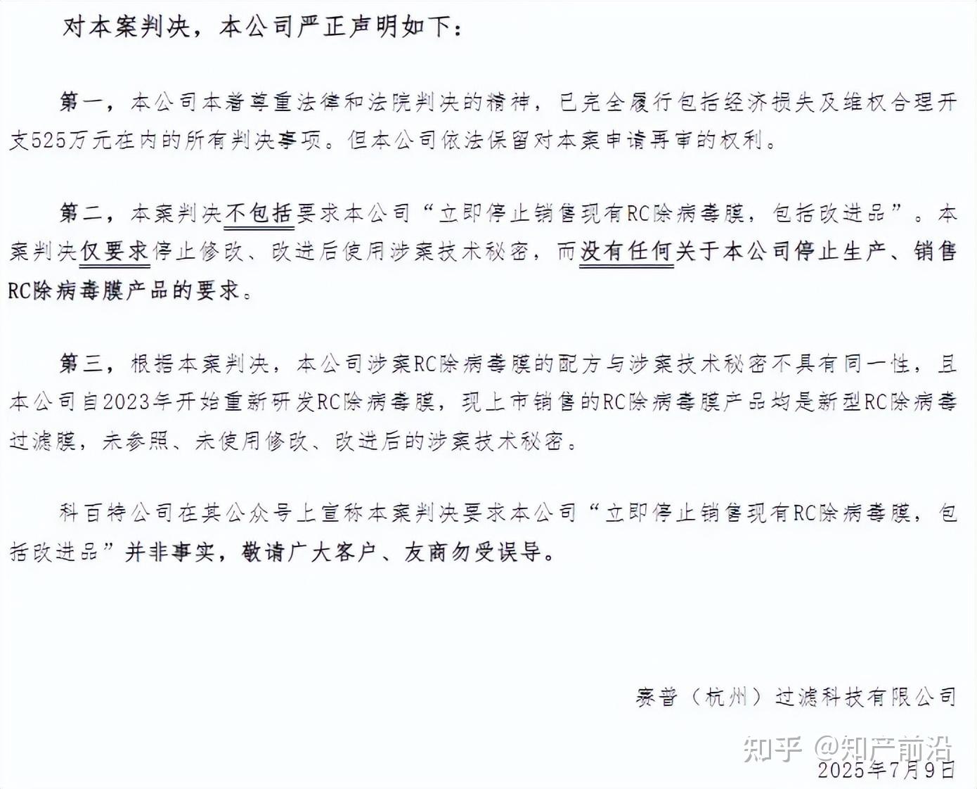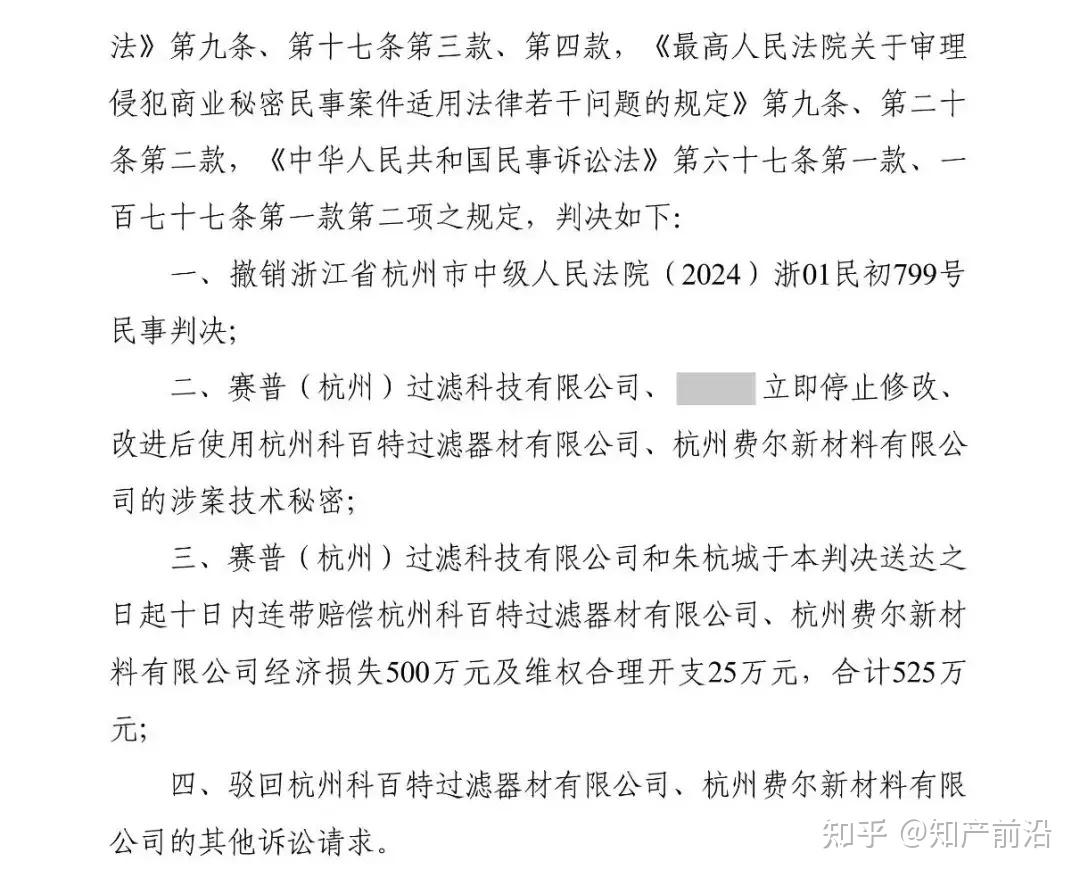 2026-03-05 环球过滤分离技术网 guolvfenlitech6 在生物制药的产业版图上,过滤膜是确保药品质量、安全与合规的关键耗材,长期以来,过滤膜核心技术与市场为国外巨头垄断。2020年新冠疫情爆发,全球供应链中断、进口产品价格飙升,疫苗生产所需的高端过滤膜需求激增,众多制药企业因此饱受“缺膜停产”之苦。 近年来,随着国产替代浪潮兴起,一批以赛普过滤、乐纯生物、艾里奥斯等为代表的本土企业正奋力突围,力图打破过滤膜技术“卡脖子”困境。在高端病毒过滤膜这一细分领域,目前国内市场上具备研发与量产能力并形成一定竞争态势的,主要有科百特与赛普过滤两家企业。 作为国产过滤膜领域的先行者,科百特从半导体过滤切入生物医药,逐步建立起自身的技术壁垒。赛普过滤则是成立于2021年的新兴企业,被杭州科技局认定为“雏鹰计划”企业,专注于过滤膜技术研发,尤其在除病毒膜领域崭露头角。该两家企业被寄予打破国外垄断的厚望。然而,这两家国产替代的“希望之星”,却逐渐陷入一场旷日持久的知识产权纠纷。 RC除病毒膜商业秘密纠纷判决的“文字游戏”:一场罗生门? 2025年6月,浙江省高级人民法院对科百特与赛普过滤之间备受关注的RC除病毒膜技术商业秘密侵权案(2025)浙民终75号作出二审判决。 根据判决书,法院判决:“赛普(杭州)过滤科技有限公司、朱某立即停止修改、改进后使用杭州科百特过滤器材有限公司、杭州费尔新材料有限公司的涉案技术秘密。”同时,判决赛普过滤和朱某连带赔偿科百特经济损失500万元及维权合理开支25万元,合计525万元。赛普过滤表示尊重并履行了判决,并已支付全部赔偿款项,但保留申请再审的权利。 (2025)浙民终75号判决书(部分) 科百特在其公众号发文称,法院判决赛普“立即停止销售现有RC除病毒膜,包括改进品”。赛普过滤对此回应,本案判决“不包括要求本公司‘立即停止销售现有RC除病毒膜,包括改进品’”,且“没有任何关于本公司停止生产、销售RC除病毒膜产品的要求”。赛普进一步解释称,根据判决,其涉案RC除病毒膜的配方与涉案技术秘密不具有同一性,且公司自2023年开始已重新研发RC除病毒膜,现上市销售的产品均为新型RC除病毒过滤膜,未参照、未使用修改、改进后的涉案技术秘密。 一字之差,谬以千里。对于判决结论的不同表述,可能对公众和市场造成潜在误导。 “停止修改、改进后使用涉案技术秘密”,指的是对涉案技术秘密的特定使用方式进行限制,意味着被判侵权方不能在未经许可的情况下,对原始的涉案技术秘密进行修改、改进或在此基础上开发新产品并加以使用。但这并不等同于全面禁止销售其所有相关产品,特别是那些不直接侵犯该涉案技术秘密的、或通过其他合法途径独立研发的产品。 最高人民法院在“蜜胺”技术秘密侵权案【(2022)最高法知民终541号】中指出,若技术秘密为制造产品所不可或缺的重要条件,则禁止使用应包括禁止销售,以避免侵权损害后果的继续发生或扩大。赛普过滤方发布声明表示,其现有上市产品是2023年以来重新开发的,不涉及本案涉案技术或其修改、改进,赛普过滤已履行赔偿义务,但保留申请再审的权利。 而此种选择性解读和一定程度上夸大判决结果的误导性宣传,在高度依赖产品信誉和市场信任的生物医药行业,可能会对一家初创企业的品牌形象、市场拓展乃至融资前景造成负面影响,也为过滤膜领域的国产替代之路蒙上了一层迷雾,毕竟,当前过滤膜技术的自主可控,不仅关乎商业竞争,更直接影响国家生物医药产业的战略安全。 硝烟弥漫的专利战:正当竞争的IP组合拳还是“围剿式”同行打击? 除了商业秘密案的判决争议,科百特对赛普过滤发起的一系列多维度、高频次的知识产权行动同样值得关注。 公开信息显示,自2022年12月起,科百特针对赛普公司多款产品发起了多起专利侵权诉讼,这些诉讼涉及赛普的核心产品,包括深层过滤器、针头除病毒过滤器、Teomax超滤膜包、PES除病毒过滤器等 。面对这些侵权指控,赛普过滤采取了常见的防御策略,例如,积极对科百特的相关专利提出无效宣告请求。 截止本文发布之日,公开显示的11项专利无效结果中,有8项科百特专利被国家知识产权局宣告全部无效: 此外,另有3项科百特专利被宣告部分无效:ZL202122390031.0(涉及除病毒预过滤器,关联案号:(2022)浙01知民初555号)、ZL202221072905.6(涉及Teomax膜包生产模具)、ZL202221090849.9(涉及Teomax膜包生产模具)。 核心专利的无效也影响了多起侵权案件的走向,多起专利侵权案件因涉案专利被宣告无效而导致科百特撤诉或法院驳回起诉。 科百特对赛普过滤发起的知识产权诉讼数量众多、类型多样,且频率较高。然而,在赛普过滤提出的多项专利无效宣告请求中,科百特的大多数涉案专利最终被国家知识产权局宣告无效。科百特对国家知识产权局做出的多项专利无效决定不服,提起了多起行政诉讼。截至2025年7月11日,公开信息显示有8起行政诉讼正在进行中,多数一审维持了无效决定(驳回原告科百特的请求),部分已进入二审程序或等待二审开庭。 这种现象引发了业内对科百特专利质量和诉讼策略的高度关注,当一家企业的众多专利被宣告无效,却仍持续地发起多维度、高频次的侵权诉讼,这可能表明其诉讼策略并非完全基于专利的内在稳定性或基于被控侵权产品的