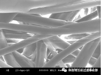 2.1熔喷滤芯 熔喷滤芯是采用聚丙烯粒子,经过加热熔融、喷丝、牵引、接受成形而制成的管状滤芯。其本身的制作工艺决定了它的滤芯纤维较粗(如图2.1),做工较粗糙,过滤精度差,孔隙粗糙不均匀导致滤芯不能完全被利用,流量小,SDI值波动大。从而导致保安过滤器需要配备较大的滤芯数量,所以过滤器的所占空间较大,滤芯更换麻烦,费时费力。目前常见的保安过滤器,配备的熔喷滤芯数量为50—80芯,更换一个过滤器的滤芯的时间基本上在3小时以上。 图2.1 普通熔喷滤芯纤维电镜图 2.2大流量折叠滤芯 折叠滤芯是将纤维做成膜之后进行折叠,进而制作成滤芯,其本身的工艺决定了它拥有做工精细,过滤精度高,过滤性能稳定,过滤面积大等特点。而在此基础上发展出的大流量滤芯,更有流量大,纳污能力强,更换简便,SDI控制稳定等特点。同时搭配使用的大流量过滤器因为大流量滤芯流量大的优点,占地空间较小,体积可比普通保安过滤器小33—50%,而同样的流量下,滤芯的数量可以少90%以上,使得更换时间节约80%以上。目前常用的保安过滤器,一般为4—8芯,更换时间基本在0.5—1小时。 科百特的HF150大流量滤芯,采用的是目前最为先进的深层过滤技术,拥有均匀梯度的5层膜结构,纳污空间更大,寿命更长。如下图2.2.1 同时,滤材采用进口纳米纤维膜(如图2.2.2),保证了整支滤芯非常高的过滤精度和过滤稳定性。独特的网罩和V型密封圈,使其具有更大的极限耐压能力和密封性能。 2.3大流量滤芯与熔喷滤芯对比分析 大流量滤芯与传统熔喷滤芯的各方面详细对比如下表2.3所示 综合以上所有特性,大流量滤芯在保安过滤环节正逐渐成为主流,熔喷滤芯因为自身的局限性,正慢慢被淘汰。 3.典型案例分析 3.1滤芯设计不合理导致寿命偏短 江西某厂家回用水单元采用双膜法,保安过滤环节采用大流量滤芯,且使用的为进口品牌产品。正常情况之下,滤芯可使用1—2个月,但滤芯实际使用7天就堵塞。客户无法找到原因,最后将堵塞后的滤芯交给科百特实验室,进行分析。实验室首先将滤芯进行了解剖,表明滤芯为单层膜结构,且堵塞物集中在折谷处,其余膜表面几乎没有污堵,如图3.1.1 在此基础上,实验室对滤膜的不同位置分别进行了电镜扫描,折谷处如图3.1.2,已完全堵塞,折峰处如图3.1.3,少量堵塞,折坡处如图3.1.4,几乎无堵塞 根据初步测量计算,堵塞面积约占滤膜总面积的1/7,所以有6/7的膜没有起到过滤作用,滤芯设计不合理,导致滤芯没有被完全利用。本身单层膜的结构纳污空间就很小,加上6/7的膜被浪费,导致了寿命仅仅只有几天时间。继续进行膜片效率对比测试,测试结果表明在截留效率方面,科百特的滤芯也明显高于此进口滤芯。 最后,客户使用了科百特提供的拥有5层膜结构的HF150大流量滤芯,目前使用情况非常稳定。客户对科百特的产品也有很好的评价,产生了很高的信任度,目前已在稳定采购。