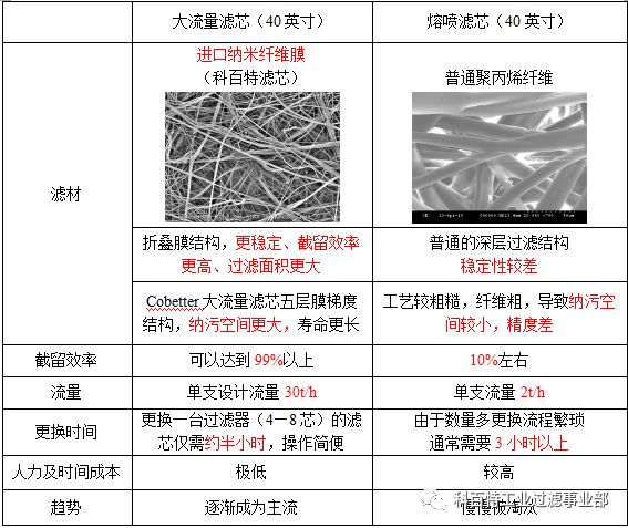1.保安过滤常见问题分析 保安过滤一般介于超滤与反渗透之间,所起的作用为除去超滤出水中的剩余颗粒物杂质,控制反渗透进水的SDI,保护价格昂贵的反渗透膜。其中的保安滤芯属于易耗品,需要不定期的更换,我们发现很多业主方普遍对保安滤芯的关注点为保安滤芯的寿命偏短,更换频繁。而根据我们长期的应用经验,得出的原因大致有以下几点: ① 保安滤芯本身纳污空间小,质量差,容易污堵; ② 原水水质波动大,水质差不稳定; ③ 预处理装置过滤精度低,导致保安过滤进水SDI过高; ④ 前段超滤断丝严重,导致大量杂质漏过; ⑤ 系统流量超出保安过滤器的设计流量,滤芯超负荷运行; ⑥ 夏天水中微生物较多; ⑦ 加药系统故障或药量不合理。 因为这些问题的存在,以及业主方对滤芯寿命的诉求,导致了大量的国内厂家甚至一些进口产品的代理商投机取巧,从而带来了保安过滤的另一个问题,也是常常被忽视的问题:保安滤芯寿命较长但是拦截效率很低。而这带来了一个更严重的问题,反渗透进水SDI不稳定甚至超标,使得反渗透膜在一定程度上使用寿命变短。众所周知,反渗透膜的成本是远远高于保安过滤的。当然,不排除某些项目的预处理做的非常好。但就我们目前通过对众多现场的考察并结合实验室分析,我们实际了解到的情况是,保安滤芯寿命超长通常都是以牺牲滤芯的拦截效率为代价。而性能卓越的保安滤芯,可以在如此多外部因素变化不定的情况下,给反渗透装置提供最大程度的保护。 本文将主要从滤芯本身出发,来分析解决电厂客户在保安过滤环节实际遇到的问题。 2.常用保安滤芯分析 目前常用的保安滤芯有两种,一种是比较传统,工艺比较简单的熔喷滤芯,另一种是现在应用越来越多,工艺比较新颖,技术含量也较高的大流量折叠滤芯。