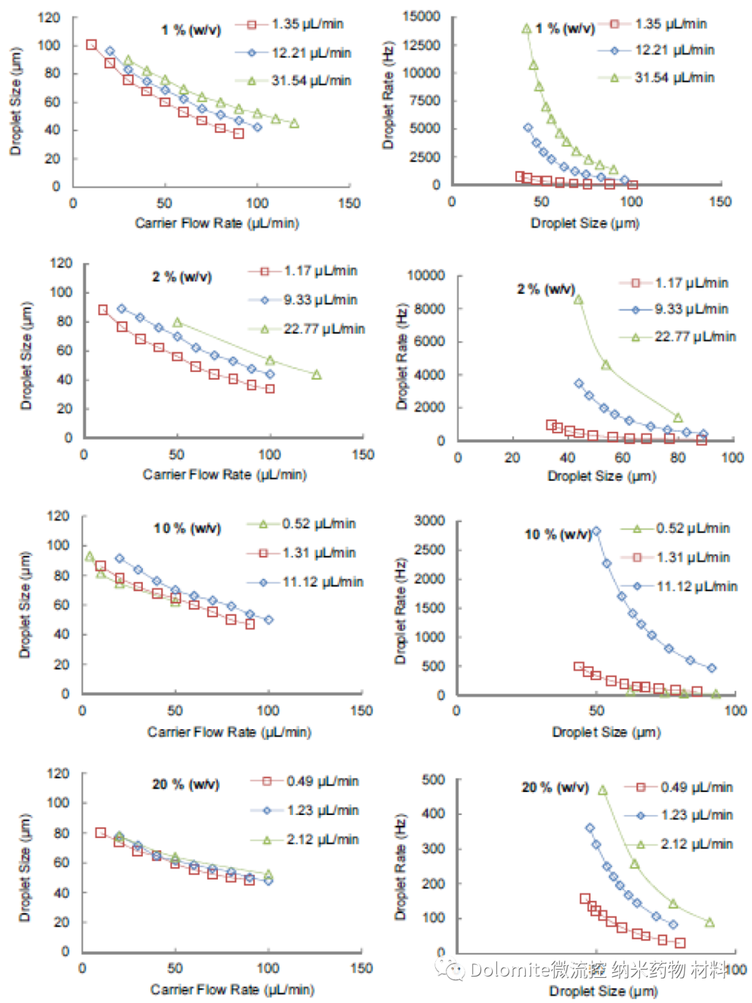 左图:3种液滴流速下,液滴尺寸随载液流的变化