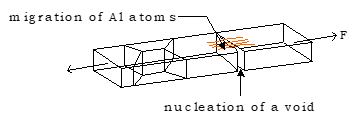 所谓电子迁移(Electromigration),乃指在电流作用下的金属。此系电子的动量传给带正电的金属离子所造成的。当组件尺寸愈缩小时,相对地电流密度则愈来愈大;当此大电流经过集成电路中的薄金属层时,某些地方的金属离子会堆积起来,而某些地方则有金属空缺情形,如此一来,堆积金属会使邻近的导体短路,而金属空缺则会引起断路。材料搬动主要原动力为晶界扩散。以溅镀法所沉积的Al,经过适当的Anneal之后,通常是以多晶(Poly-Crystalline)形式存在,当导电时,因为电场的影响,Al原子将沿着晶粒界面(Grain-Boundary)移动。