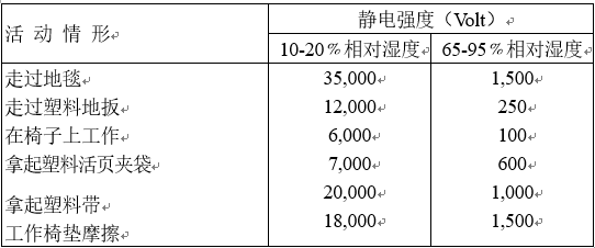 自然界的物质均由原子组成,而原子又由质子、中子及电子组成,在平常状态下,物质呈中性,而在日常活动中,会使物质失去电子,或得到电子﹒此即产生一静电,得到电子的物质为带负静电,失去电子即带正静电。静电大小会随着日常的工作环境而有所不同,如下表所示。
