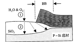 在用Si3N4作为掩膜制作fieldoxide时,在Si3N4覆盖区的边缘,由于氧或水气会透过PadOxideLayer扩散至Si-Substrate表面而形成SiO2,因此Si3N4边缘向内会产生一个鸟嘴状的氧化层,即所谓的Bird'sBeak。其大小与坡度可由改变Si3N4与PadOxide的厚度比及FieldOxidation的温度与厚度来控制。