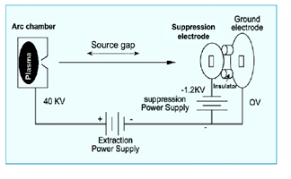 Extraction Electrode是离子植入机中用来将Source的Arc反应室中的离子以电压萃取出来的两个电极板。由电子抑制极板(Suppression Electrode) 和接地极板(Ground Electrode)两部分组成。
