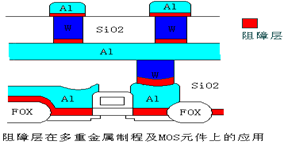 为了防止铝合金与硅的的接触界面发生尖峰(spiking)现象,并降低彼此的接触电阻,在铝合金与硅之间加入一层称为阻障层的导体材料,常见的有Ti/TiN及TiW。