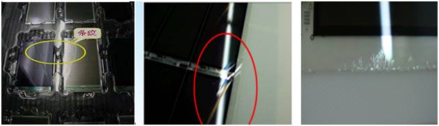 (3)蚀刻时,玻璃脱轨重叠在一起,清洗不到的玻璃面会出现条纹;