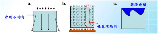 (8) 喷淋式蚀刻:Nozzle堵塞造成玻璃局部蚀刻液更新不及时,间接降低药液浓度,从而降低蚀刻速率,形成表面不匀。