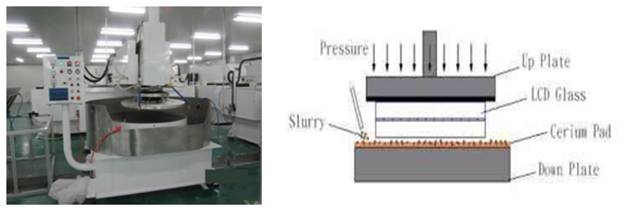 使用抛光粉加纯水形成抛光液做加工介质,下流经机台盛盘与panel之间,借机台运转做相对运动,使硬质磨料(如氧化铈抛光垫等)直接接触面板表面进而切屑panel表面。