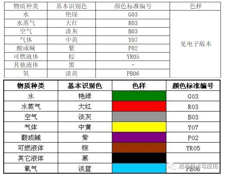 4.1根据管道内物质的一般性能,分为八类,并相应规定了八种基本识别色和相应的颜色标准编号见下表。