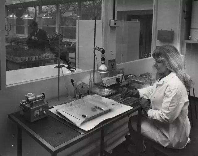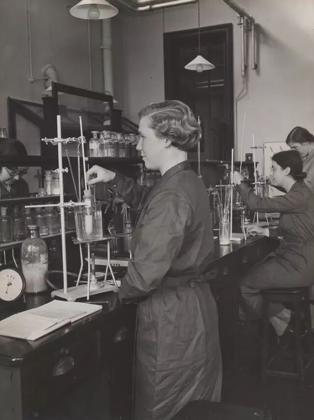某学生在科学实验室,mid-1940s一位女实验员在自己的岗位专心实验