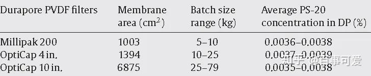 过滤器尺寸通常会依据Vmax和通量综合考虑选择。表2提供了一个70g/L单抗产品的例子,其中原液中含有0.004% PS-20。通过Durapore滤器的过滤仅导致PS-20的少量损失,并且药品的PS-20浓度仍在0.0035%以上,完全在制剂规格范围内。由于无菌和产品质量要求,在灌装完成操作中不考虑对过滤器进行缓冲液预处理,必须根据灌装设施和设备采取替代的缓解方法来提高均匀性。