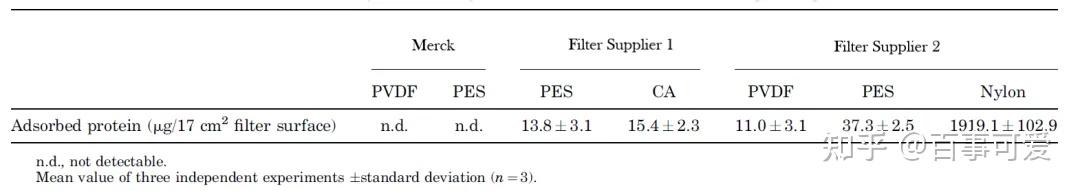 蛋白在除菌滤器上的吸附程度与膜材质紧密相关。如在某单抗蛋白的吸附研究中,评估对比了不同供应商提供的过滤材料:包括用于蛋白药物过滤的三种最推荐的过滤膜聚偏二氟乙烯(PVDF)、聚醚砜(PES)和醋酸纤维素(CA),聚酰胺(尼龙Nylon)过滤膜作为蛋白质吸附的阳性对照。结果显示(表1),尼龙过滤器对蛋白的吸附最为显著,每17cm²过滤表面吸附量可达1.9±0.1mg;而PVDF和PES过滤器的吸附量则相对较少,在11-37μg/17cm² 范围内,吸附量少100倍。默克的PVDF和PES滤器未检测到蛋白吸附。不同供应商的相同膜材质,其蛋白吸附程度也存在差异,这可能是由膜制造或制备工艺不同导致膜的表面性质有所区别。此外,除菌滤器不仅由过滤膜本身组成,还包括其他支撑层,在实验中测试的是整个过滤膜,这也可能导致蛋白质吸附。相关研究表明,聚山梨醇酯可减少蛋白吸附,这种效果在尼龙过滤器中最为显著,在醋酸纤维素过滤器中也明显可见。