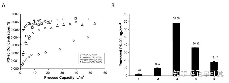 不同材质除菌滤器对吐温的吸附差异明显,PVDF材质滤器对吐温吸附最少。如图1A所示, Durapore(PVDF)过滤器对PS-20最小吸附饱和点约为10L/m²,Express SHC(PES)的最小吸附饱和点约为40L/m²,而Nylon过滤器是PS – 20吸附饱和点值最高。为提高除菌滤器的载量,通常在膜过滤器内的0.2μm膜层顶部使用具有较大孔径的预过滤层,虽然这额外的膜层可能提高除菌滤器的性能,但它也可能导致额外的PS - 20吸附。从图1B可知,双层膜相比于单层膜的吐温吸附量约是2倍。因此,如果在载量相当的情况下,考虑最小化PS - 20吸附,可以优先考虑单层过滤器。