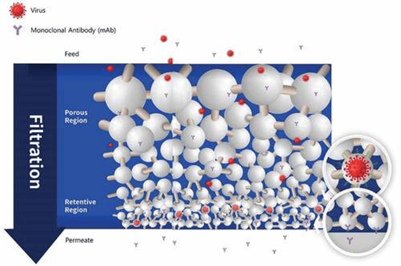 图1. 除病毒过滤过程中病毒去除和单克隆抗体传输的示意图。