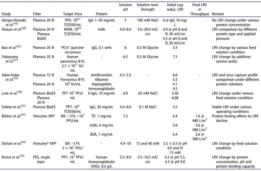 化学因素,如溶液的pH值、电解质浓度、蛋白质种类和添加剂,对病毒清除率(LRV)有显著影响。研究已表明,不同pH和电解质浓度下,某些过滤器的LRV存在差异,强调了进料溶液化学特性在遵守现行病毒清除法规中的重要性。表2汇总了影响病毒清除性能的化学因素研究,包括过滤器类型、目标病毒、蛋白质、料液条件及其LRV结果。