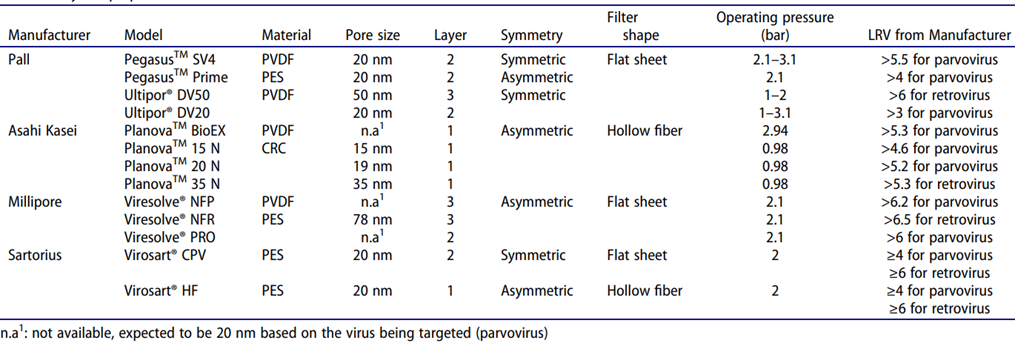 商用过滤器的代表性材料、物理性能和病毒去除性能总结于表1中。商用除病毒过滤器由单层或多层的聚合物材料、对称或不对称的过滤器形态组成,目的是产生高去除性能。对于生物制药下游工艺中的除病毒过滤,使用直流过滤(NFF)系统确保了高产品回收率和工艺简单性,其中施加的压力方向和溶液滤过方向相同。如表1所示,Ultipor® DV50、PlanovaTM35 N和Virosolve® NFR等过滤器用于去除大型病毒,如鼠白血病病毒、猿猴病毒40和牛病毒性腹泻病毒。同样,PegasusTM SV4、Prime、Ultipor® DV20、PlanovaTM BioEX、15 N、20 N、Virosolve® NFP、PRO、Virosart® CPV 和 HF 用于去除小病毒,如猪细小病毒 (PPV)、MVM、和细小病毒 B19。如前所述,除病毒过滤最常用的是使用小型病毒截留过滤器。