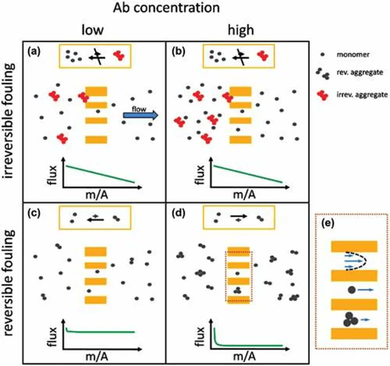 最近的研究提出了两种污染机制:可逆污染和不可逆污染,这两种机制可以通过蛋白质的特性来区分。Bieberbach等人的研究表明,通过调整进料溶液中蛋白质的特性,可以区分这两种污染机制。具体来说,蛋白质浓度决定了通量是由可逆污染还是不可逆污染控制。在他们的研究中,使用了三种不同类型的抗体,研究了它们的通量下降行为以及缓冲液冲洗和清洁的效果。研究发现,含有高百分比高分子量物质的蛋白质会导致不可逆污染(缓冲液冲洗后没有通量恢复),而其他蛋白质则允许一定程度的通量恢复。不可逆污染不仅会导致病毒清除率(LRV)降低,还可能导致显著的产品损失和操作时间延迟。