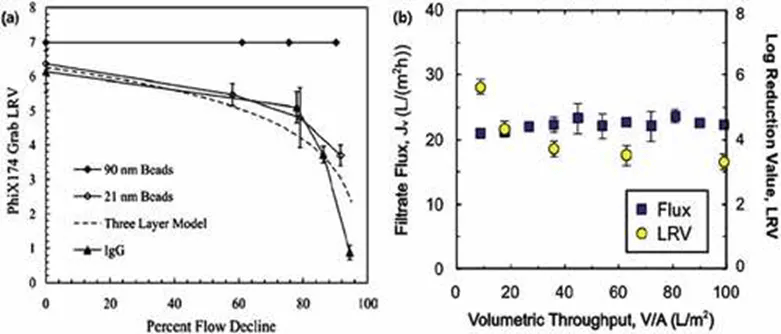 其中N代表层数,x代表游离病毒的分数,S代表筛分系数,V代表滤液体积,VR代表储存区的体积。该模型成功地将高达100 L/m2的PP7噬菌体的病毒清除与各种初始病毒浓度相关联。此外,研究表明,在高流量条件下,通过保持高达100 L/m2的恒定滤液通量,可以降低LRV。LRV的下降可能与通量的下降无关。