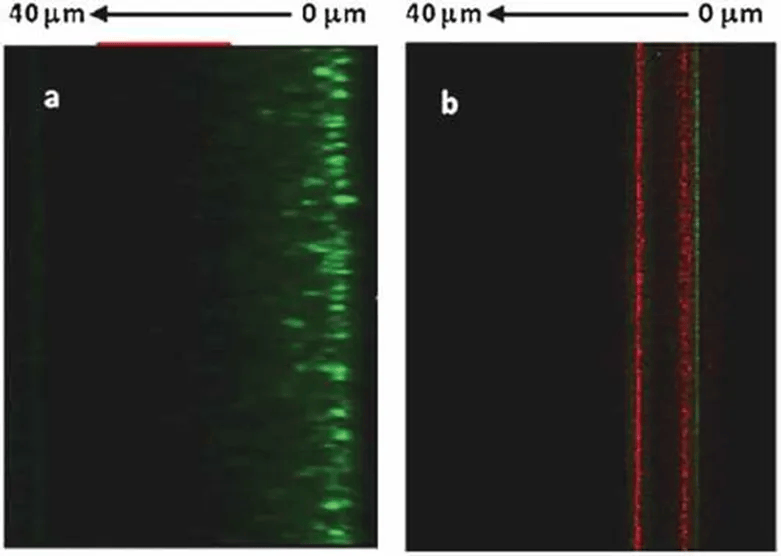 图 5. 在恒压下过滤荧光标记的 ΦX -174 后(左)和压力释放实验后(右)Ultipor®DV20 的横截面图像。Cy5 标记(红色)噬菌体用于压力释放前的挑战,SYBR 金标记(绿色)噬菌体在压力释放后使用。