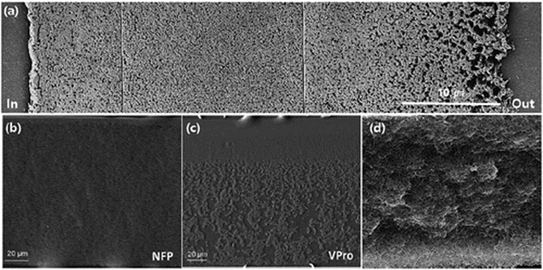 图 2.商用除病毒过滤器的扫描电子显微镜 (SEM) 图像(横截面)(a) PlanovaTM 20 N、(b) Viresolve® NFP、(c) Viresolve®PRO 和 (d) Ultipor® DV20。